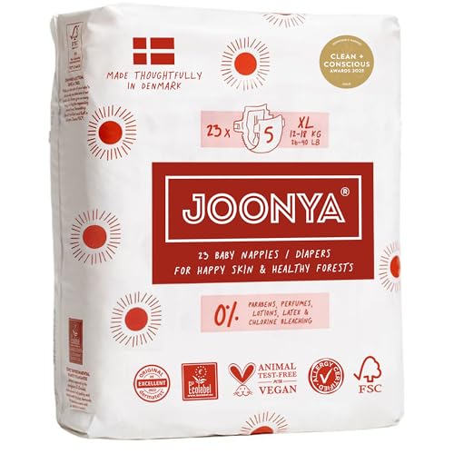Joonya Babyluiers, maat 5 XL (12-18 kg) - 1 zak van 23 - **Nieuw assortiment** - Niet giftig, milieuvriendelijk, ultradun, 's nachts - Made in Denmark