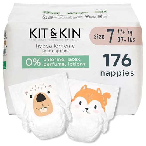 Kit & Kin Premium Eco babyluiers, maat 7, 17+ kg, bundel van 176 luiers, plantaardig en hypoallergeen, superieur tot 12 uur lekbescherming, veganistisch en dierproefvrij